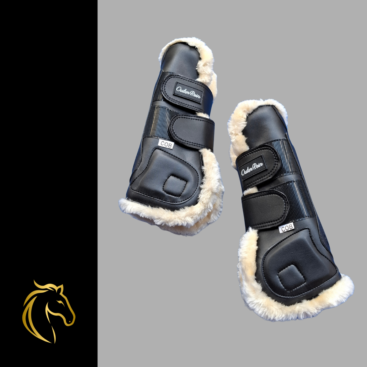 OuterRein jännesuojat ovat hevosellesi miellyttävät ja hyvin istuvat. Suojissa on pehmusteena laadukas tekokarvavuori. Kiinnitys on helppoa kestävillä ja laadukkailla tarroilla. Mustat suojat ovat tyylikkäät niin arkeen kuin kisoihinkin!